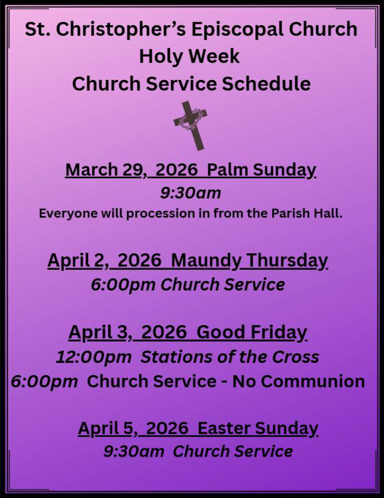 Schedule of Services: 1st Sunday of the month-Rite I Holy Eucharist at 9:30am. All other Sundays-Rite II Holy Eucharist at 9:30am. For Rite I, we will be using our prayer books for the service.